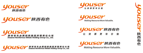 同時,在英語中er是表示人的名詞化后綴,比如teacher; worker等。因此,youser體現企業是人的聯合體,體現企業“以人為本”的核心理念。標志以完全獨立設計的美術英文字體為為主體,配以中文字體,具備獨特性,同時更加適合同權屬企業標志組合。標志色彩為初升太陽的橘紅色,象征著陜西有色集團作為新型的大型集團企業,好像一輪蓬勃的紅日,朝氣蓬勃。