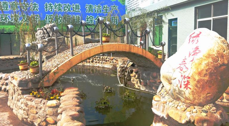 最吸引眼球的莫過于車間辦公室前面的小花池了!形色各異的石頭砌就的圍堰獨(dú)具特色,碧綠的池水上架著一座微型拱橋,廢舊物料制作的銀白色立柱、圓球形套環(huán)與黑褐色鐵鏈組成的安全護(hù)欄,一下子把小橋裝扮得韻味十足。兩塊形態(tài)獨(dú)特的文化石屹立在池水中,一塊寫著“清風(fēng)池”,另一塊寫著“綠凈春深”;水面上的噴頭如一朵小蓮花正吐露著銀色的水花;難得的暖陽灑向水面,紅色、黃色、銀白色的小金魚聞聲成群結(jié)隊地向我們游來,不時激起一圈圈漣漪。“清風(fēng)池”上微風(fēng)徐來,“綠凈春深”意境悠遠(yuǎn),怎一個美字了得?不由得讓人駐足觀望,仿佛自己走進(jìn)了鬧市中公園一角。