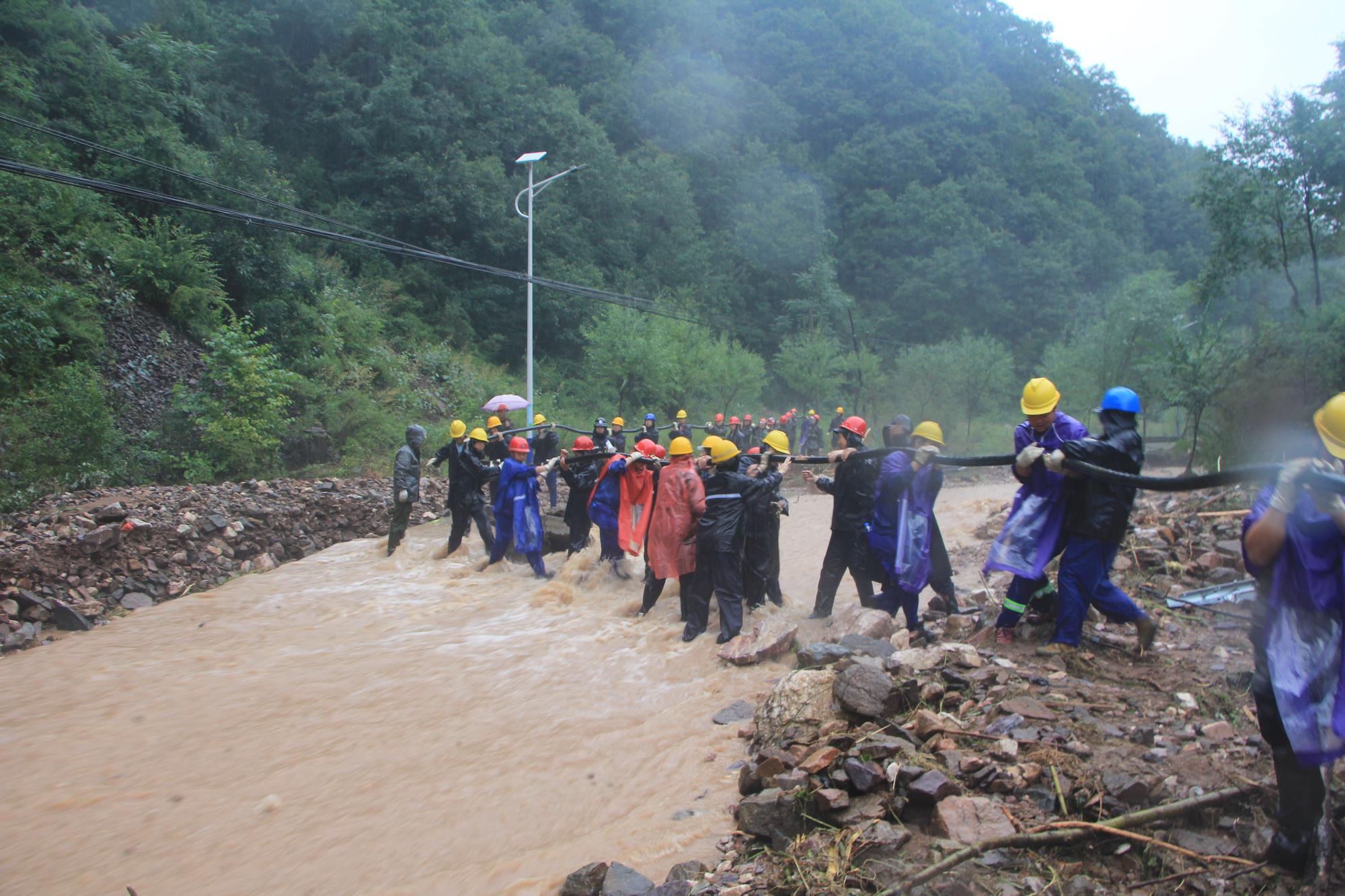 在水庫方向電力中斷后,分公司各應急小組人員開始集結,于凌晨3時,開始分批次巡查,巡查人員身背斧頭在沒有道路的山坡上硬是砍出行走的路,徒步10多公里的水毀路段,對水源電路進行巡查。10時許,經排查,發現33號、34號電桿傾倒,35號電桿底部懸空,沿途多處高壓線纜被滑坡后倒塌的樹木側壓接地,分公司一方面組織人員砍伐壓線樹木并對百花地區電力線路進行恢復,一方面立即召開緊急會議,制定搶修方案。