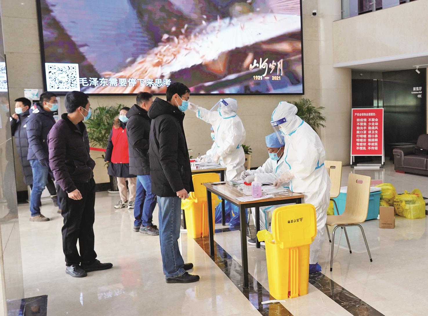 在公司總部所在的渭南金城大廈樓下的核酸檢測點,身著金鉬向陽花志愿者服裝的隊員們在寒風瑟瑟中提前布置現(xiàn)場、畫好隔離線、貼好站位貼、核對人員信息、維持排隊秩序、引導職工有序檢測、配合醫(yī)護人員采樣……用實際行動守護職工的生命健康。