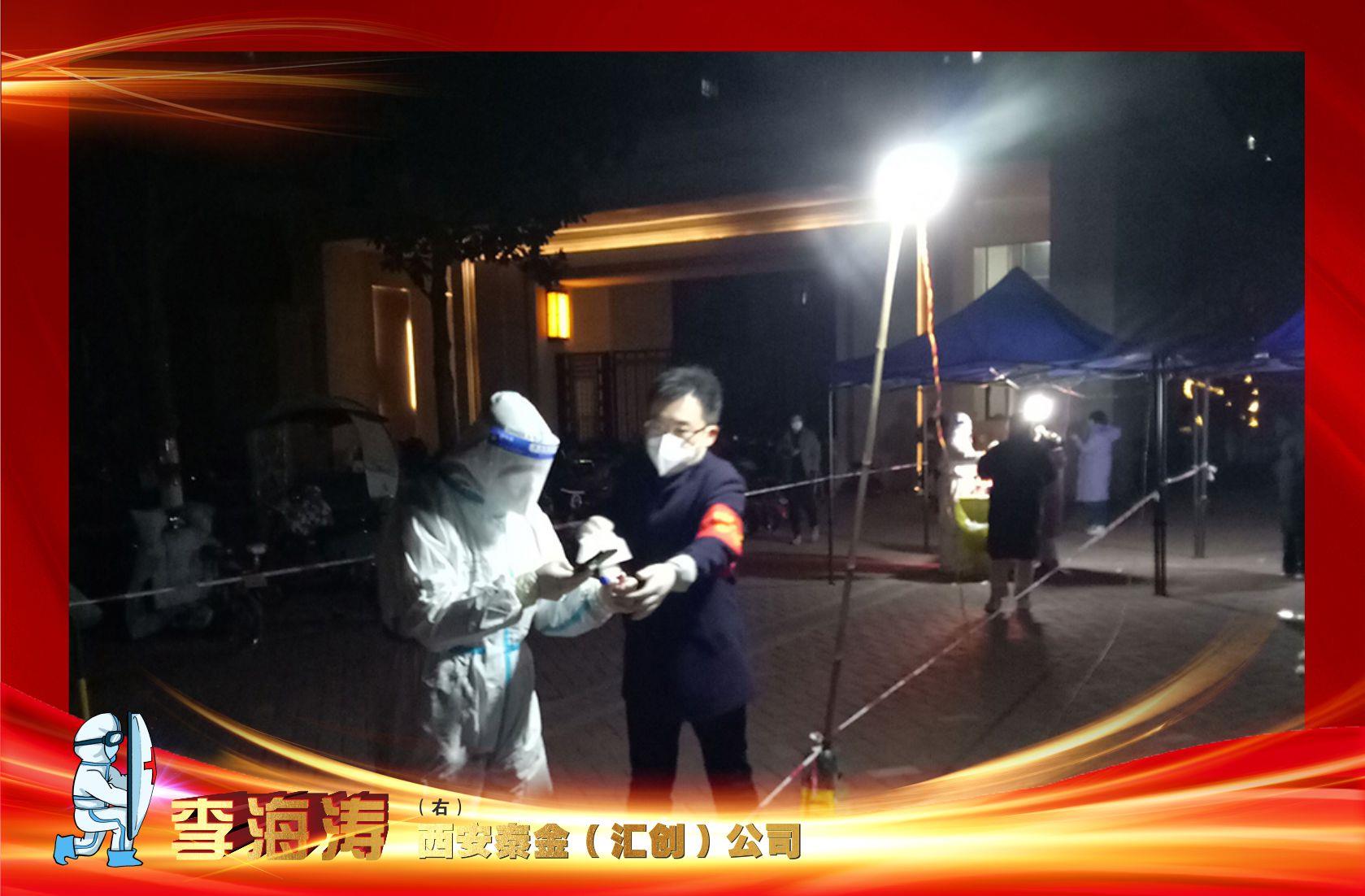 晚上9點多,在延興門社區(qū)海倫國際小區(qū)值勤的黃金集團(tuán)西安秦金(匯創(chuàng))公司副總經(jīng)理李海濤反復(fù)核實核酸檢測信息。夜里氣溫低,他冷的想打哆嗦,手指頭僵硬的像沒了感覺。跺跺腳、搓搓手,寒風(fēng)里始終堅守著崗位,只為更多的家庭“宅”的放心,睡的安穩(wěn)。