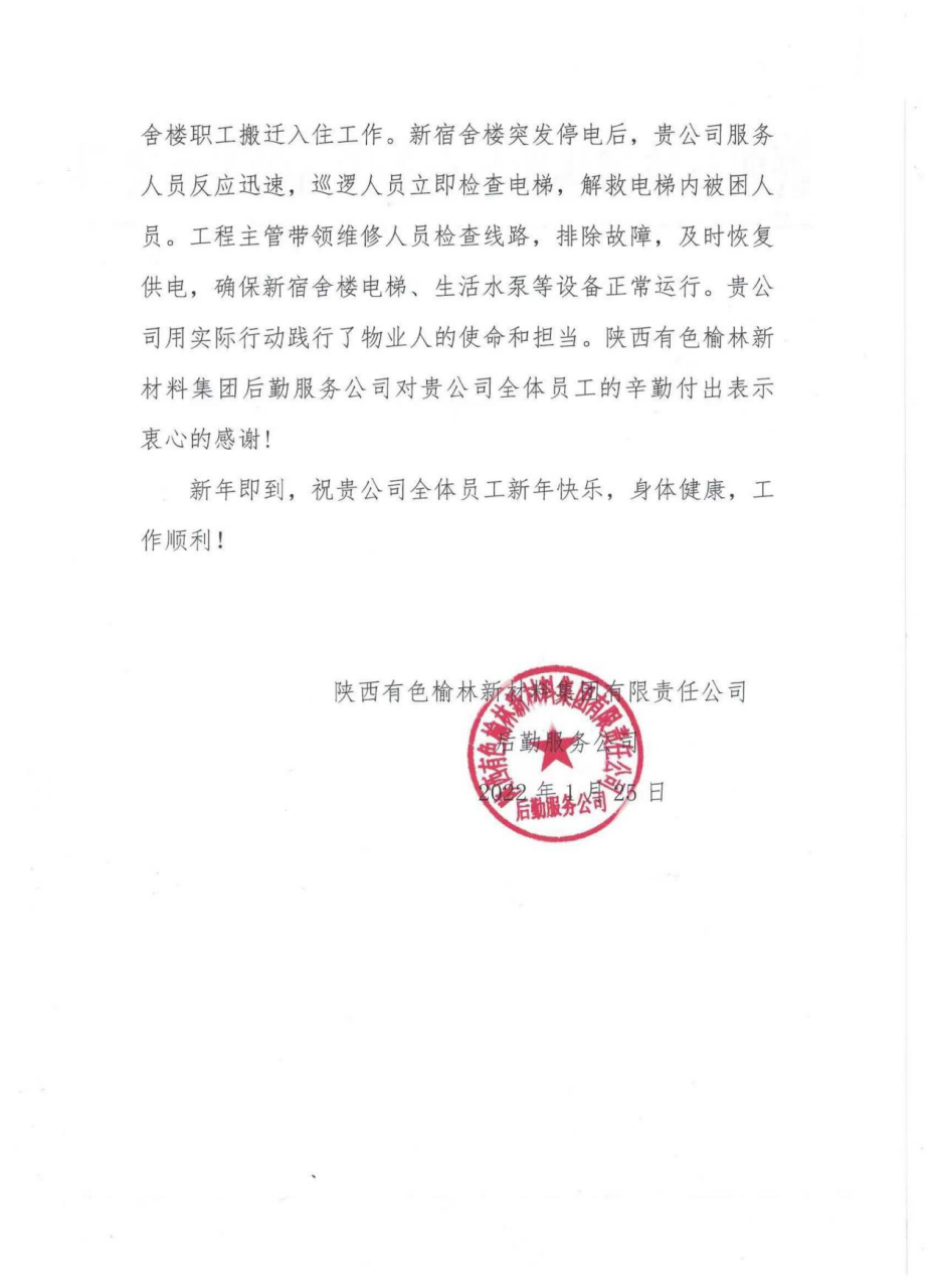 新材料后勤服務公司的致謝,是對園區物業服務工作的肯定,也是對物業員工的鼓舞。邁特物業員工紛紛表示:有付出就有收獲,將更加細化物業服務工作,進一步提高服務品質,為榆林新材料職工創造舒適、安全、美好的生活環境。