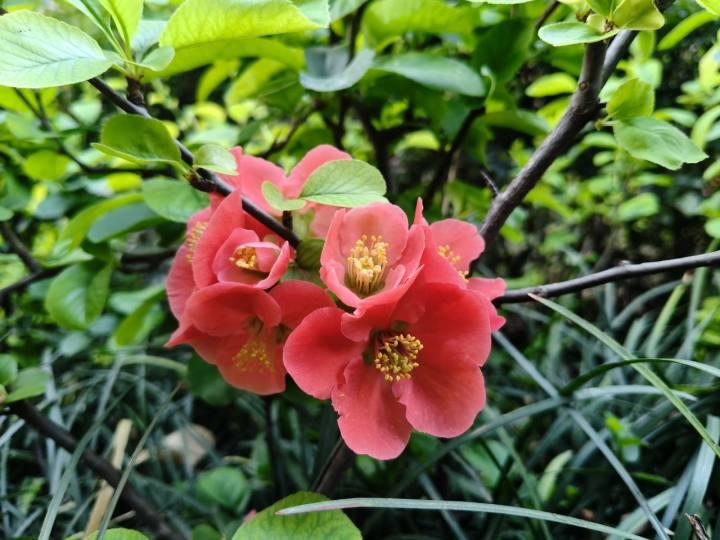我不由自主地放慢腳步,湊近細賞,只見那貼梗而生的花朵,紅的似火,粉的如霞,有的簇擁相偎,有的獨自綻放。嬌嫩的花瓣層層疊疊,錯落有致,交織出一幅幅絢爛的畫卷;花蕊恰似點點嫩黃的星辰,靈動地點綴其間,飄散出絲絲縷縷、若有若無的清甜香氣。微風拂過,花枝隨風輕擺,花朵相互輕撫,恰似跳躍的音符,在共同譜寫一曲無聲卻動人的樂章。這美妙的旋律瞬間驅散周圍的喧囂,在公司門口營造出一方充滿詩意的小天地。
