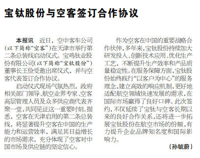 近日,空中客車公司(以下簡稱“空客”)在天津市舉行第二條總裝線啟動儀式。寶雞鈦業(yè)股份有限公司(以下簡稱“寶鈦股份”)董事長王儉受邀出席儀式,并與空客代表簽訂合作協(xié)議。