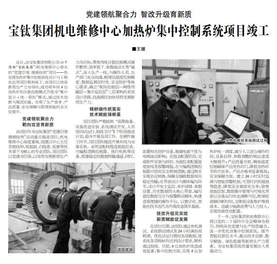 近日,由寶鈦集團有限公司(以下簡稱“寶鈦集團”)機電維修中心牽頭的“黨建引領 揭榜掛帥”項目——熱處理加熱爐集中控制系統設計與工程化應用項目順利竣工。該項目以培育新質生產力為導向,成功將車間4臺加熱爐的分散控制模式升級為“集中顯示+統一管控”模式,通過技術創新與規范實施,實現了生產效率、產品質量、安全保障與管理效能的全方位提升。