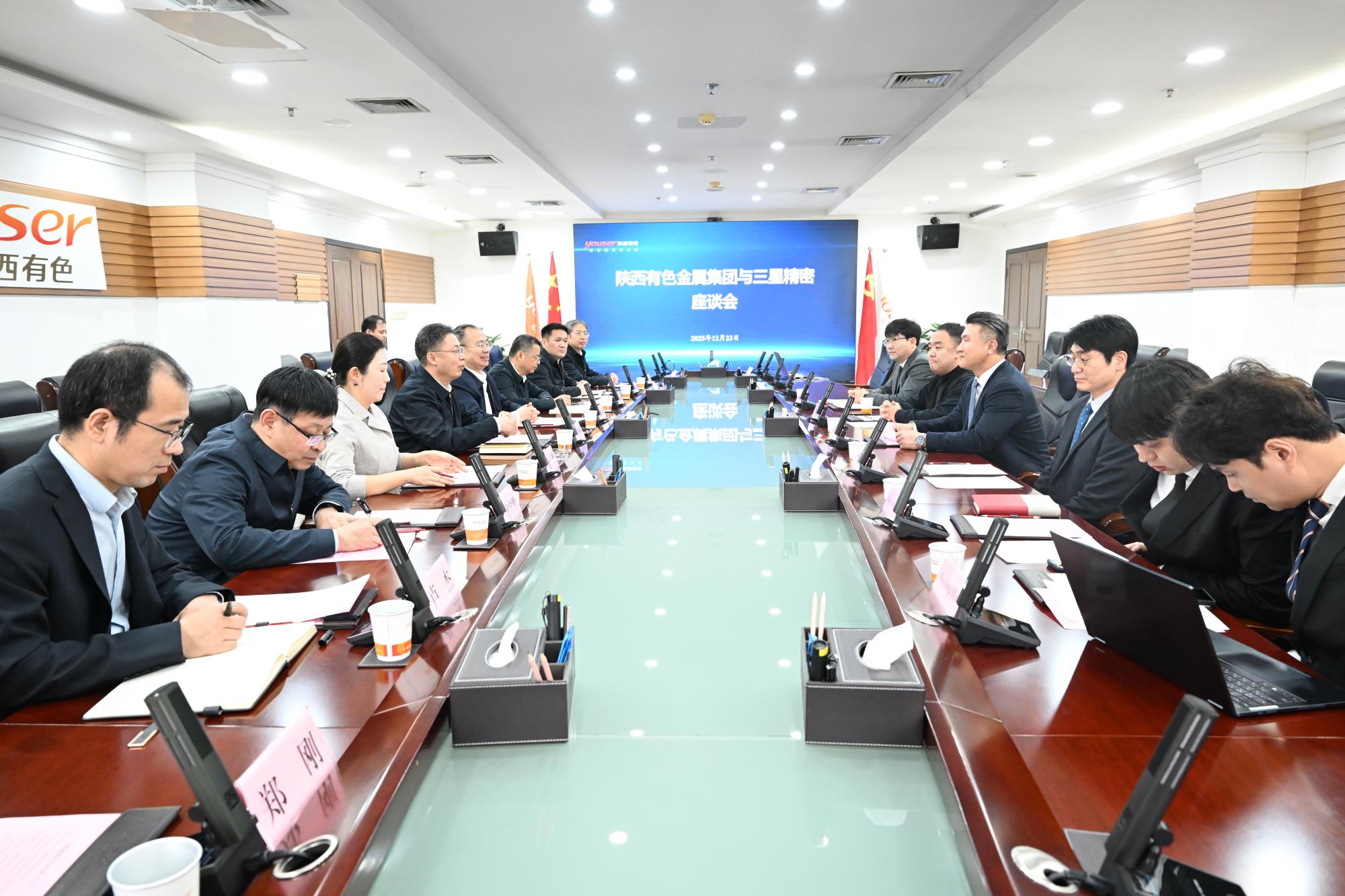 12月23日,陜西有色金屬集團(tuán)黨委書記、董事長(zhǎng)吳群英在集團(tuán)總部與三星精密總裁、首席執(zhí)行官Bae Yin Yeol一行圍繞輕量化材料產(chǎn)業(yè)合作、拓展合作領(lǐng)域等座談交流。三星精密管理總經(jīng)理、高級(jí)常務(wù)董事Jo Yong Nam,陜西省商務(wù)廳駐韓國(guó)代表處總代表金珍,集團(tuán)公司黨委委員、副總經(jīng)理黃忠良參加座談。