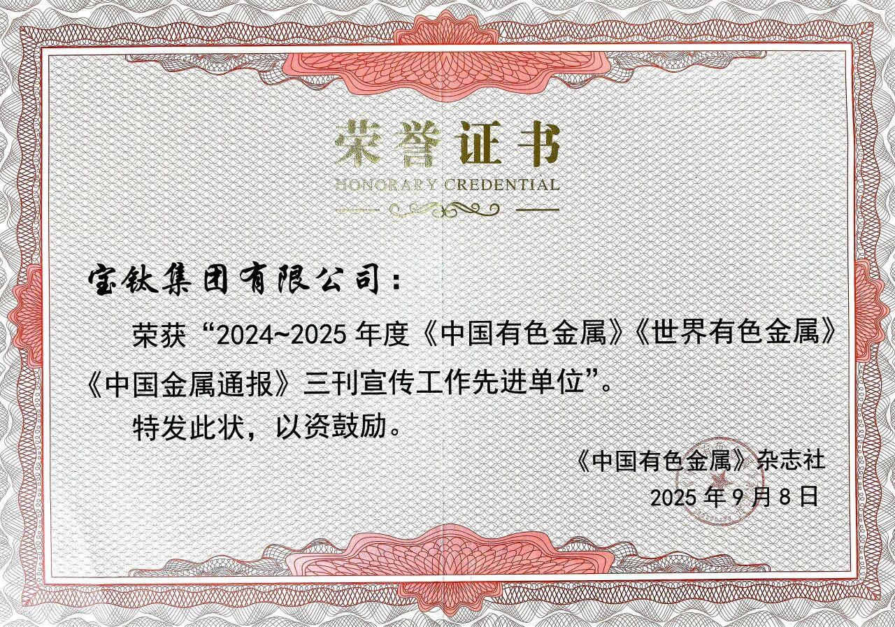 在9月18日至19日召開的第26屆《中國有色金屬》《世界有色金屬》《中國金屬通報》三刊特約通訊員暨《中國有色金屬工業年鑒》撰稿人工作會議上,寶鈦集團榮獲2024——2025年度“三刊”宣傳工作先進單位稱號。