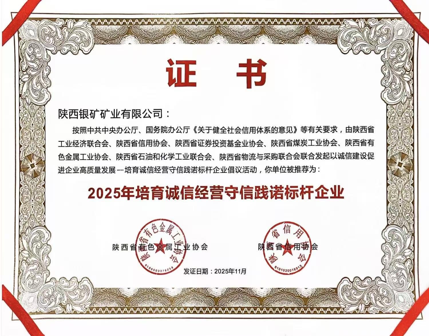 近日,陜西銀礦礦業有限公司被陜西省有色金屬工業協會與陜西省信用協會聯合評為“2025年培育誠信經營守信踐諾標桿企業”。這一榮譽標志著陜西銀礦在誠信體系建設領域的成果獲得行業與信用管理權威機構的雙重認可。