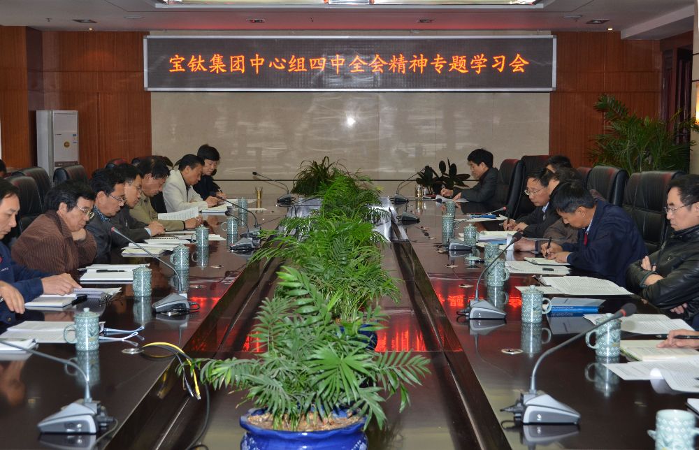 10月28日上午,寶鈦集團黨委中心學習組成員在公司九樓會議室,集中學習了《中國共產黨第十八屆中央委員會第四次全體會議公報》、《人民日報》社論《實現依法治國的歷史跨越》、中央紀委書記王岐山在中紀委第十八屆四次全會上的講話《治國必先治黨,治黨務必從嚴》等五篇專題文章,深刻領會了中共中央關于全面推進依法治國,建設中國特色社會主義法治體系,建設社會主義法治國家的精神。學習會由寶鈦集團黨委書記王文生主持,寶鈦集團領導班子成員及部分副總工程師、黨委部門負責人參加了學習會。