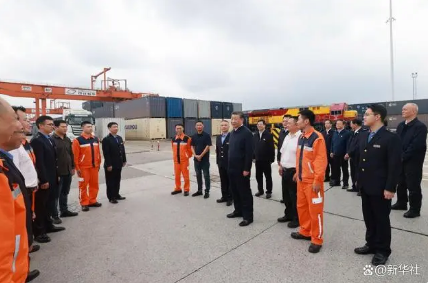隨后,習近平來到重慶鐵路集裝箱中心站,聽取貨物集散、運輸路徑、運營成本和效益等介紹,同貨車司機、列車司機、裝卸工人、場站管理人員等親切交流,詢問他們的工作強度、勞動保護、節假日休息和收入情況。習近平說,大家在物流一線,也是在對外開放一線,通過你們的辛勤勞動,很多商品跨越山海、走向世界,你們的工作很有意義。推動西部大開放、促進西部大開發,物流很重要,大家要繼續努力,不斷創造新的業績,作出新的貢獻。