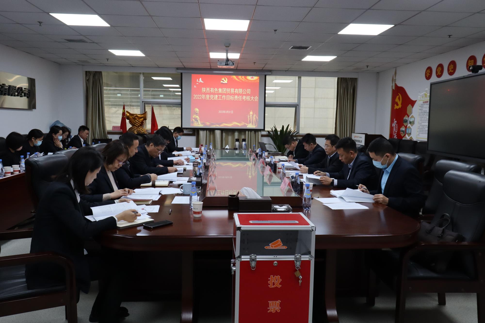 3月31日,陜西有色金屬集團黨委副書記、考核組組長郭仕龍一行,到貿易公司開展2022年度黨建工作目標責任考核。陜西有色金屬集團黨委組織部副部長宋豐杰主持會議,公司領導班子成員、中層干部及職工代表參加會議。