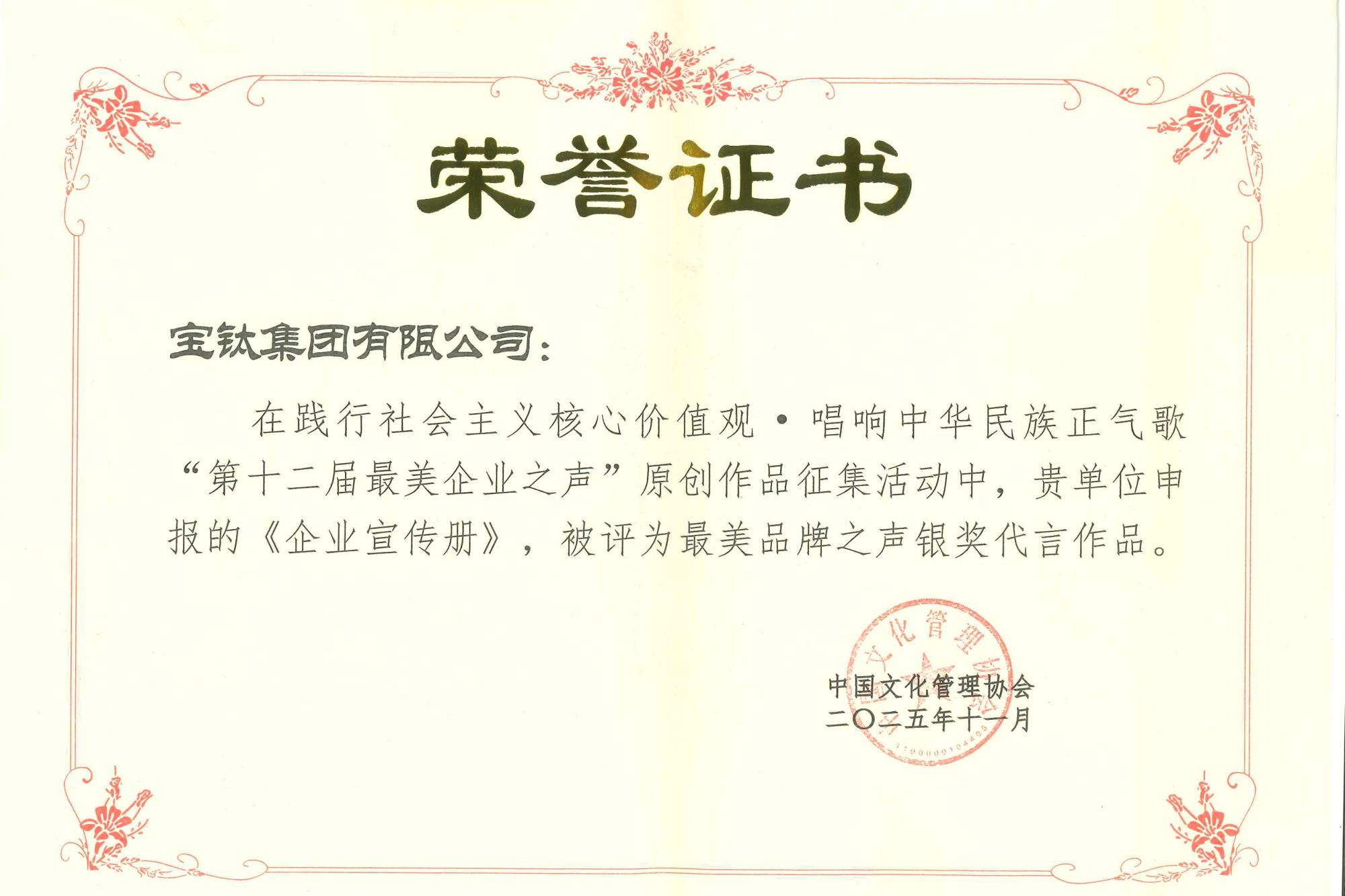 近日,2025中國文化管理協會企業黨建與企業文化年會評選結果揭曉,寶鈦集團憑借在企業文化建設與實踐創新領域的突出成果,一舉斬獲多項重磅榮譽:作品《國之棟梁 興鈦強國》獲評“最美先鋒之聲”金獎代言作品;企業宣傳冊榮獲“最美品牌之聲”銀獎代言作品;案例《以文化之力賦能企業高質量發展》被評為文化強企優秀案例成果一等獎;寶鈦集團黨委書記、董事長王儉被授予“企業文化實踐創新典范人物”榮譽稱號等。