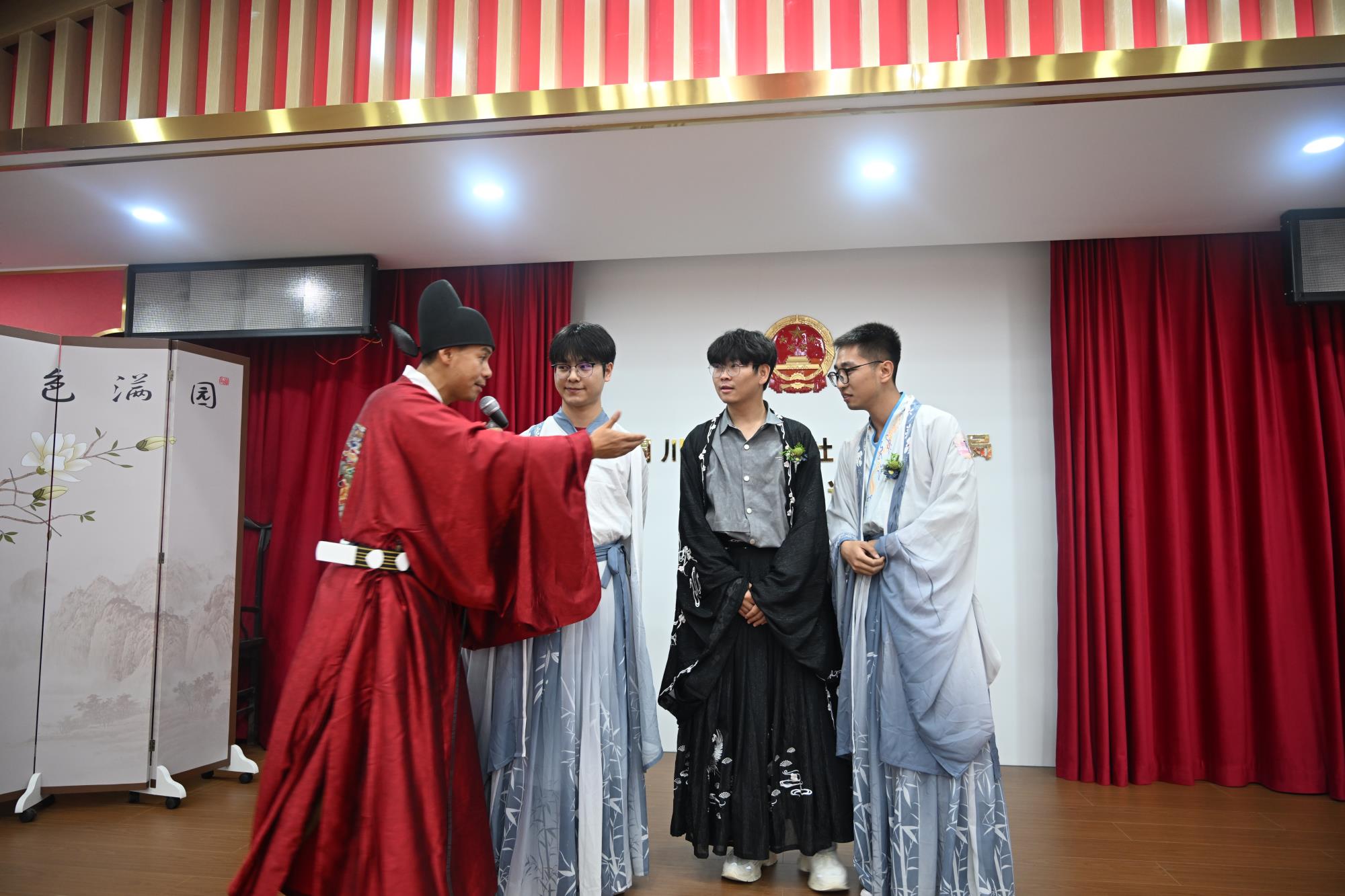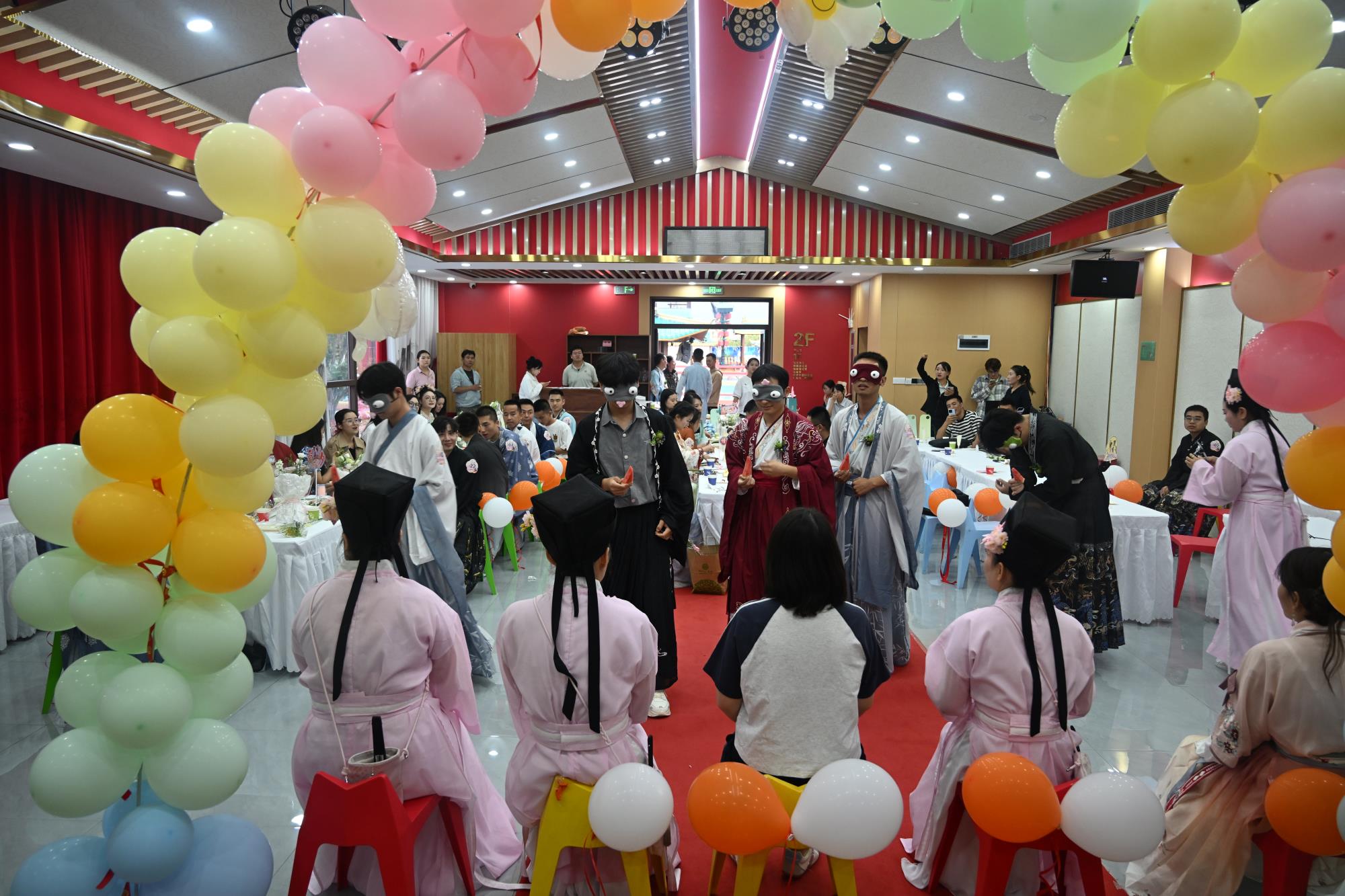 活動伊始,身著典雅漢服的青年男女在花月薈主入口簽到,領取專屬胸針與手環(huán),于古韻氛圍中沉浸式感受傳統(tǒng)文化魅力。在隨后的游園定向挑戰(zhàn)環(huán)節(jié),男女嘉賓在繽紛花海中合影留念,協(xié)力完成“終極考官”設定的趣味任務;高潮迭起的“喜從天降拋繡球”點燃全場熱情,成功搶得繡球的嘉賓組成“繡球CP”;在小劇場二樓,“愛情實驗室”趣味游戲輪番上演,“桃花朵朵開”“蒙眼遞西瓜”……現(xiàn)場氣氛溫馨融洽。在主持人的鼓勵下,多位嘉賓勇敢表達心意,最終公司5名單身青年成功牽手,收獲全場熱烈掌聲與美好祝福。