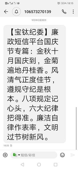 寶鈦集團紀委利用寶鈦啟明星微信公眾號、寶鈦OA協同網等新媒體平臺,轉載中央紀委國家監委在中秋、國慶節前通報曝光的違反中央八項規定精神典型案例,在利用反面典型開展警示教育的同時,一改往日說教式短信的文風,結合中秋、國慶的節日特點,自編原創以廉潔過節為主題的“打油詩”。9月18日,以“明月當空灑清輝,丹桂飄香愛相隨。清風氣正過佳節,家興百合人團圓。在中秋佳節來臨之際,祝您花好月圓夢更圓,幸福歡樂滿中秋”為內容;9月30日,以“金秋十月國慶到,金菊遍地丹桂香。風清氣正度佳節,遵規守紀是根本。八項規定記心頭,六大紀律把得準。廉潔自律作表率,文明過節樹新風”為內容,通過寶鈦廉政短信平臺向公司全體中層及以上干部發送節前提醒短信2條、共450人次。