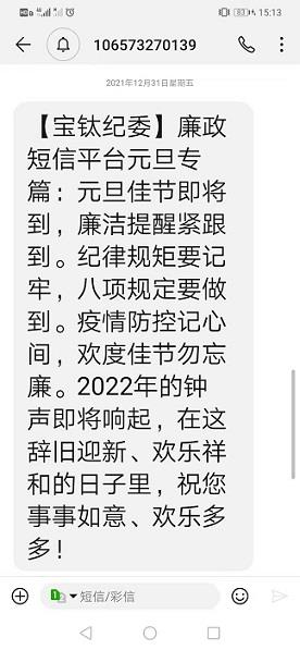節前,寶鈦集團紀委在寶鈦啟明星微信公眾號、寶鈦OA協同網廉政教育專欄刊載中央紀委國家監委公開通報十起違反中央八項規定精神典型問題和陜西省紀委監委公開通報五起違反中央八項規定精神典型問題;通過廉政短信平臺,元旦前夕向公司所有中層及以上干部發送廉政短信1條,共計225人次,要求公司廣大黨員領導干部要落實好廉潔過節的各項紀律要求,筑牢思想防線,努力營造風清氣正的過節氛圍。