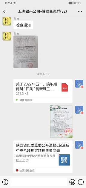 節中有檢查。4月30日,公司紀委副書記劉行前往柞水縣金米溝,對銀礦本部進行了突擊檢查,主要對留守值班、疫情防控、安全生產、車輛封存等情況作了檢查,對發現的問題即時反饋,要求立行立改、即知即改,及時完善各項工作措施,積極應對突發事件,確保公司糾治“四風”工作持續向好;公司紀委緊盯節日期間易發多發問題,圍繞違規收送禮品禮金、違規吃喝、違規使用公務用車等重點問題,針對費用報銷情況展開專項檢查并與財務部負責人進行交流,要求對存在的問題和漏洞及時進行修改和完善;全體紀檢員主動作為,對照基層單位實際生產情況,分別組織開展了節日期間糾治“四風”監督檢查。